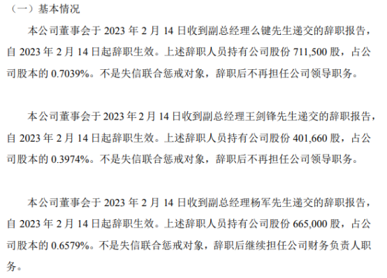 公司董事会于2023年2月14日收到副总经理王剑锋递交的辞职报告,自2023年2月14日起辞职生效。王剑锋辞职后不再担任公司领导职务。