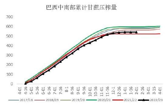图5:巴西中南部累计甘蔗压榨量 单位:百万吨