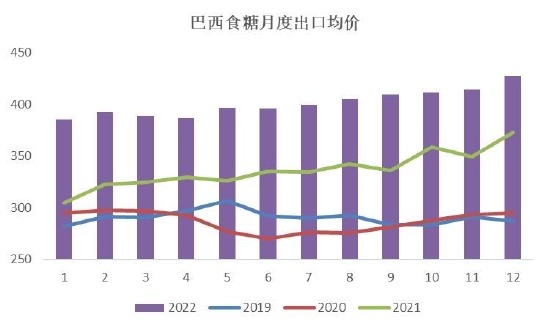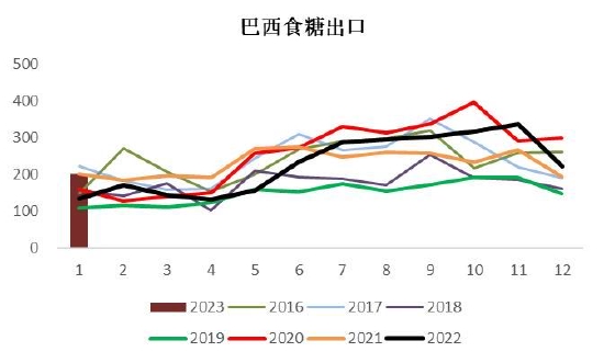 目前巴西正处于去库存、出口阶段,2022/23榨季截至目前(4月至12月)累计出口2278万吨,超去年同期2192万吨。巴西在2023年1月(22个工作日)出口了211.9万吨糖和糖蜜,金额为9.1209亿美金。日均出口量方面,巴西2023年1月的糖和糖蜜出口量为9.634万吨/日,比2022年1月(6.426万吨/日)高出49%以上,发运价格为430.30美元/吨,比2022年同期高11%以上,显示巴西食糖出口处于景气状态。尽管本年度前期受甘蔗开榨时间较晚影响出口量不及往年,但是第三季度受到天气转好和制糖利润大增提振,叠加国际糖市贸易流偏紧的影响,出口提速,远超去年同期。