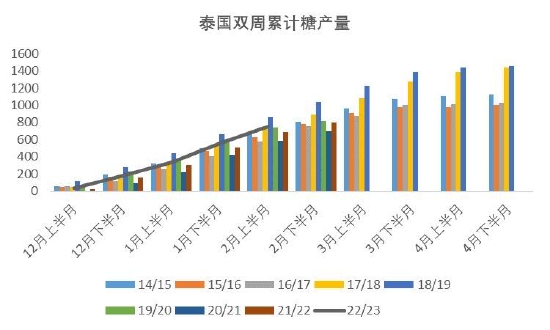 泰国2022/23榨季截至2月21日,累计甘蔗入榨量为7378.36万吨,含糖分为13.10%,产糖率为11.305%;累计产糖量为834.13万吨,其中白糖产量为147.96万吨,原糖产量为663.65万吨,精制糖产量为22.52万吨。