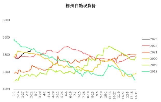 在内外因素共振下,国内期货价格的攀升带动现货价格走高,主产区制糖集团报价自春节后整体偏强,不断调高销售报价。截至2月中下旬,广西制糖集团报价区间为5850~5910元/吨,加工糖厂报价区间为6000~6200元/吨,单日成交量较节前有所上涨。现货商多以观望为主,成交量较为一般,不过考虑到元宵节之后食品厂陆续开工,对食糖有刚性需求,2月末现货端成交量较前几周有所上调,不过整体来看,成交量仍有缩减,高价对下游食糖需求有一定的抑制作用。